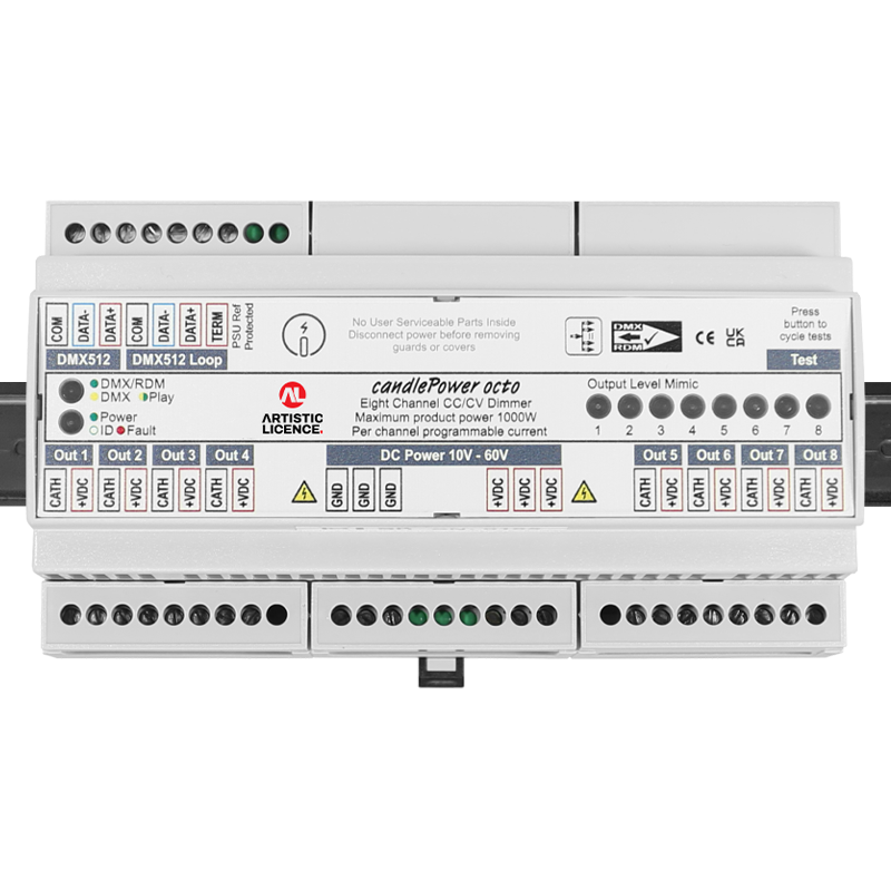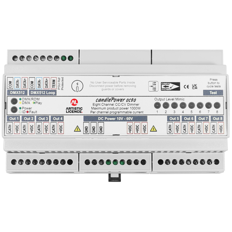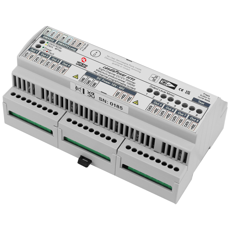 CandlePower octo es un atenuador LED controlado por DMX512/RDM con 8 canales. Cada canal se puede configurar individualmente para atenuación de corriente constante (CC) o voltaje constante (CV).