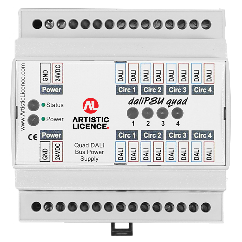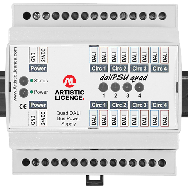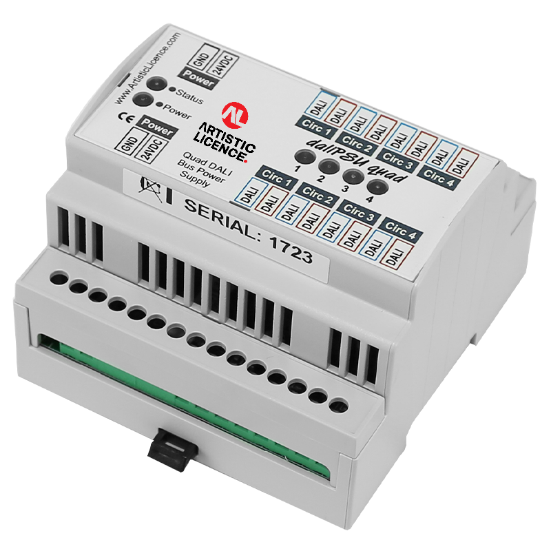 daliPSU quad se utiliza a menudo junto con el producto de licencia artística DMXtoDALI quad, que permite que un controlador DMX controle balastos DALI.