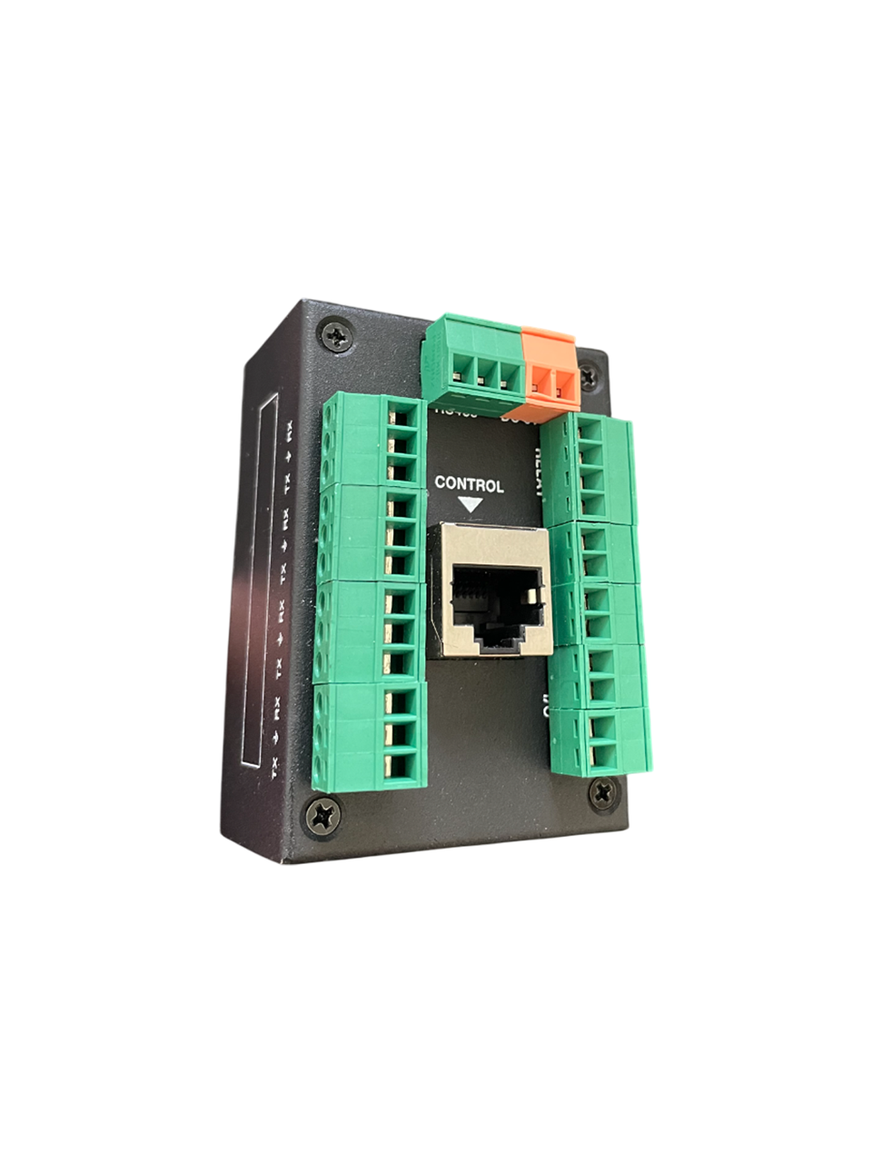 Depending on the particular application being supported artIO can communicate and be powered via PoE Ethernet or via a serial control and 24V DC power bus.