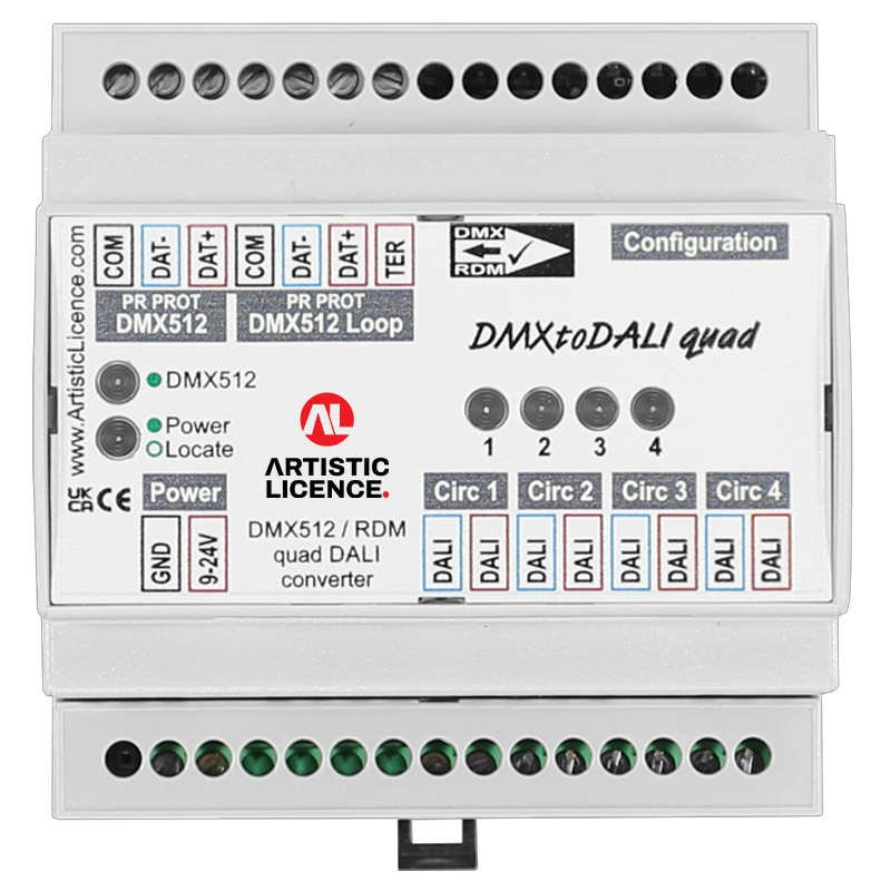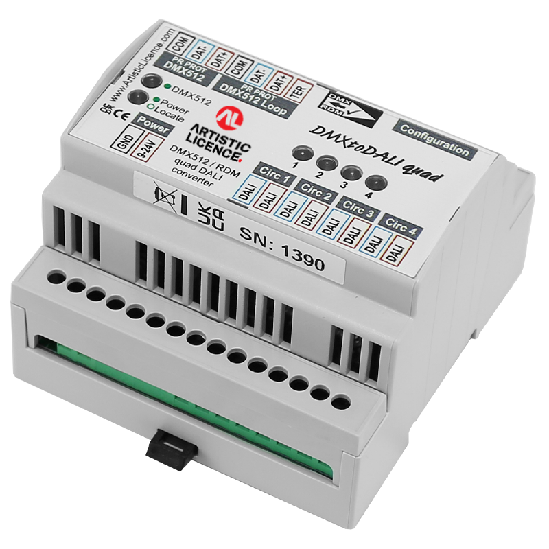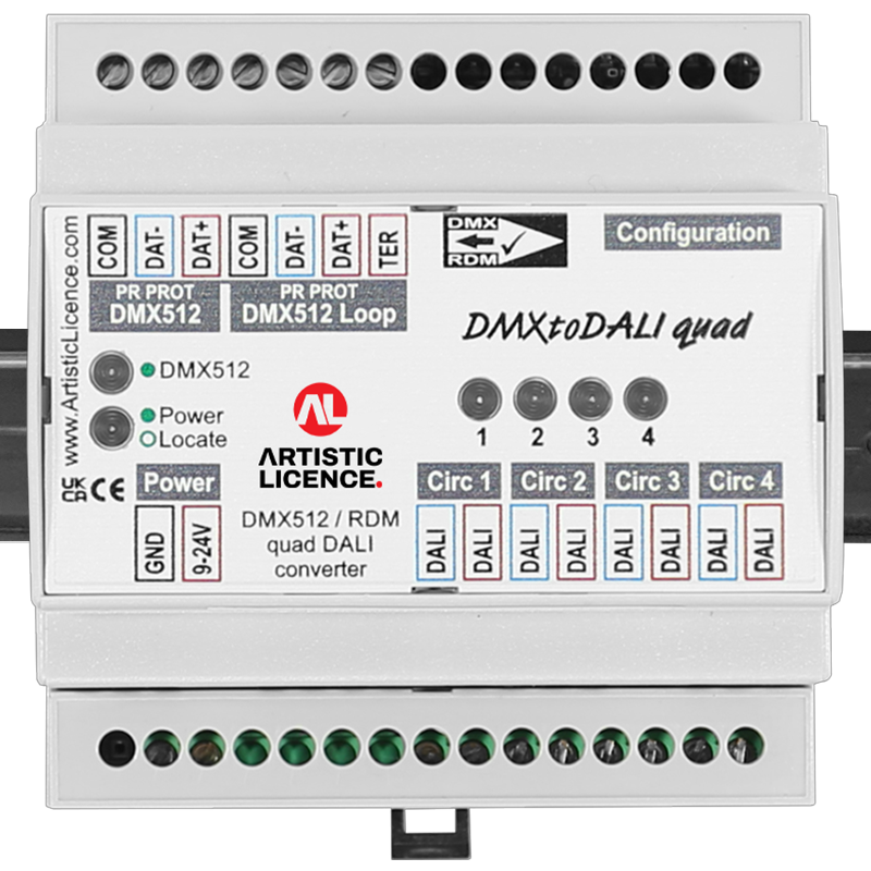 DMXtoDALI quad converts DMX values into DALI commands to allow integration between a DMX512 controller and DALI devices. Up to four DALI circuits can be controlled via DMX512 allowing up to 256 devices to be connected.