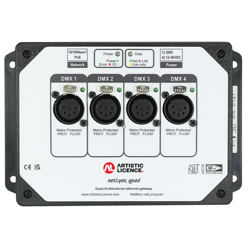 netLynx quad is an Art-Net 4 enabled ethernet-to-DMX512 or DMX512-to-ethernet gateway. It converts four universes of Art-Net (supports all versions up to Art-Net 4) or sACN into DMX512/RDM.