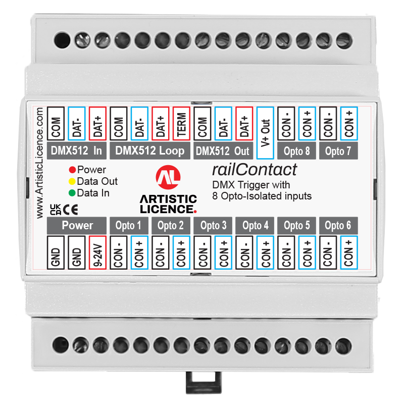 Using Rail-Contact will allow a DMX controller to be triggered, via DMX, by various switches, e.g.pressure mats. This is a perfect solution for systems that are required to be interactive with their surroundings.