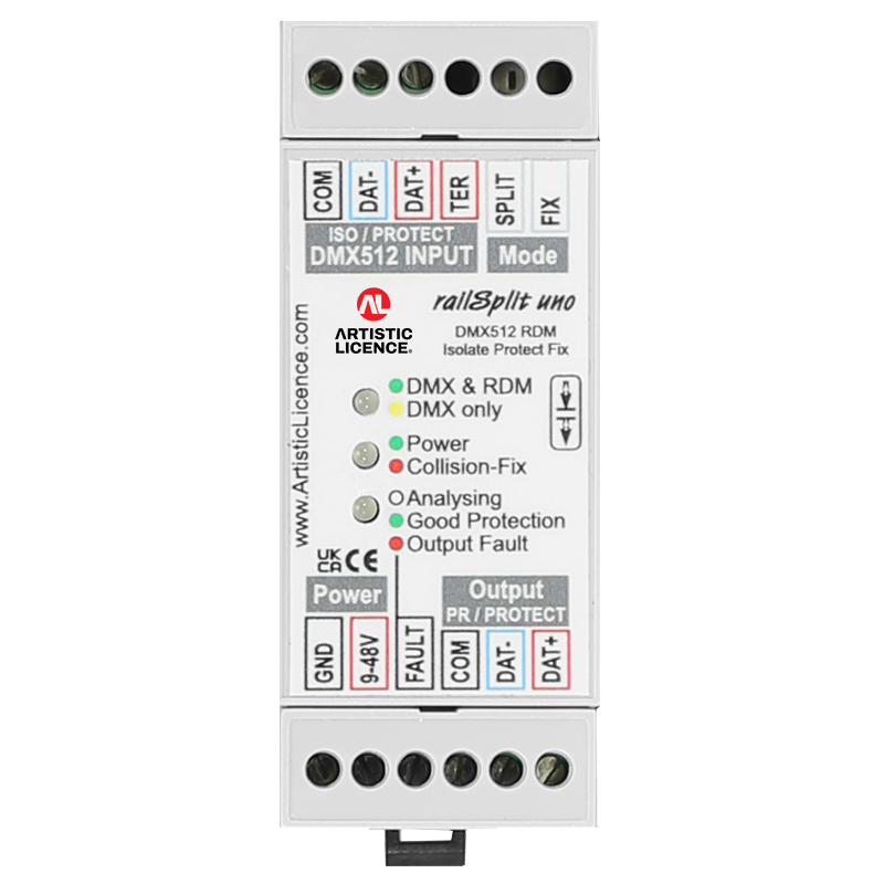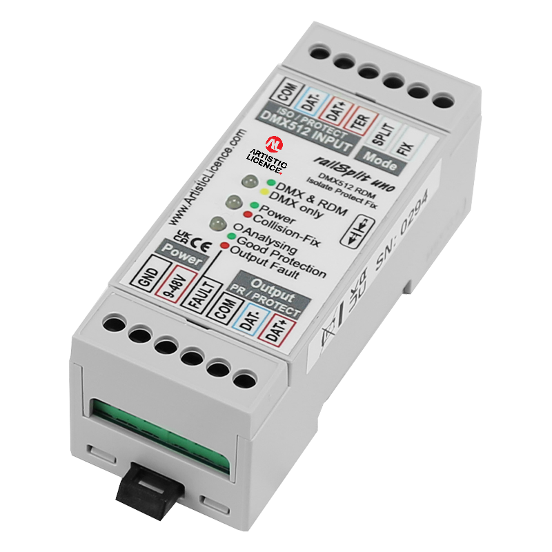 railSplit uno is a bidirectional DMX512/RDM isolator, signal booster and surge protection device, with a ‘data fixer’ for dodgy DMX.